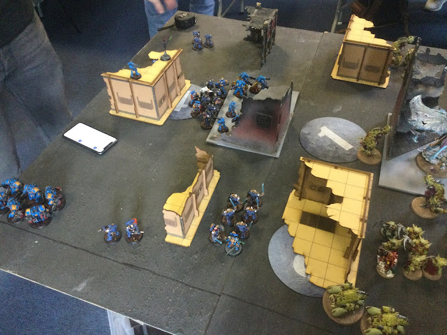 Postgame thoughts - Everything went pretty much to DG plan - grind them down in the middle and tank the rest! I never realistically considered attacking the Centurions - I couldn't get to them and wasting the odd mortar shot never felt like a good resource even if their output was very nasty. Otherwise DG were brutal in the centre, raking control of both edge objectives early in a position were they couldn't be pushed back and trading into the centre well before pulverising the Aggressor squad in a turn. It was pretty indicative of the game plan when in turn I moved one of the my units in the centre forwards and kept everything else just holding the middle - even with sticky objectives I wanted no way for Vanguard to teleport onto an empty objective.