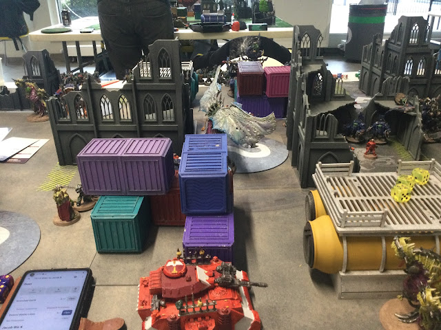 Things heat up on table one in final round as Shalaxi and Mortarion duel with Belakor and Keeper of Secrets tangling with various Death Guard forces. Also looking back I'm almost impressed how many times I managed to get pics of Mortarion facing away from camera regardless of the angle of shot. |